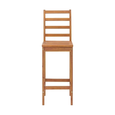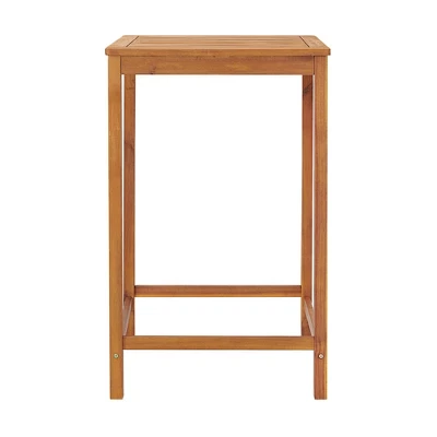 This 3-Piece acacia wood bar height outdoor bistro set is perfect addition to your outdoor space. Composed of rich acacia wood, this classic and understated set will complement any backyard or patio space. Crafted from solid acacia hardwood, both the table and the chairs are sturdy and weatherproof. The acacia wood structure makes them very durable, and the foot and backrests will allow you to sit comfortably on the chairs. This bar set is truly an excellent choice for your indoor or outdoor entertainment.