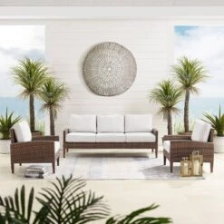 Blending cool neutral tones with natural finishes, the Capella Outdoor Sofa brings coastal swagger to your outdoor space. Ideal for lounging solo or shooting the breeze with friends, this sofa combines all-weather resin wicker with quick-drying olefin fabric cushion covers. The sofa’s classic tapered legs are made of sturdy steel that is hand-painted to look like real wood. Offering both durability and style, the Capella Sofa is a unique outdoor essential.