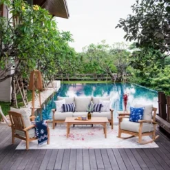 Cuddle up with your loved one on this spacious and comfy Auburn Teak Outdoor Sofa from Cambridge Casual. This beautiful patio sofa is crafted of fine quality teak wood that would last for many seasons. Pair this teak sofa with matching piece from Auburn collection to finish the best patio conversation sets.
