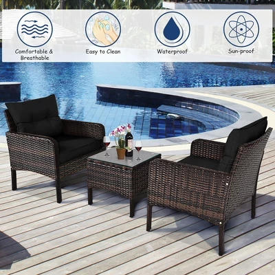 This set of outdoor furniture is made of high-quality rattan and strong steel, which is durable and has a long service life. The thick soft cushions are comfortable and breathable, which can relieve your fatigue of the whole day. Removable seat covers and tempered glass table tops are easy to clean. Modern and stylish lines make this furniture set a perfect embellishment for backyard, patio, balcony or any other outdoor space! If you are looking for such a rattan bistro set, this will be your ideal choice!