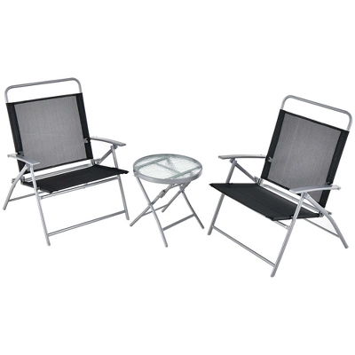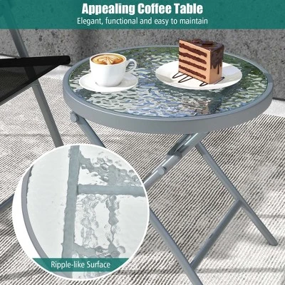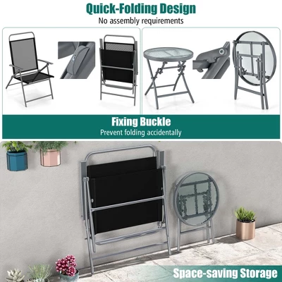 - 3PCS Patio Bistro Set: This 3-piece patio furniture set includes 2 folding chairs, and 1 glass coffee table, which can go well with any garden arrangement and landscaping. Each piece of this chair and table set can be used separately or in a group to be a great addition to any outdoor living space.