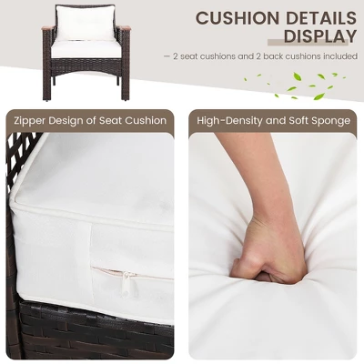 - Comfortable Single Sofas: This 3-piece rattan set includes 2 ultra-comfortable single sofas. The curved acacia wood armrests and cozy backrest will make you feel relaxed without fatigue. Every sofa comes with a seat cushion and back cushion which are filled with high-density and soft sponge. Moreover, the zipper design of seat cushion makes its cover easy to remove and clean.