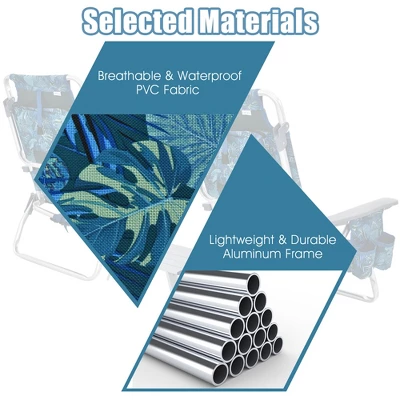 Our portable beach chair set brings comfortable and relaxing outdoor experience to you. The back of beach chair features 5 reclining positions to satisfy your different needs. Coming with comfortable pillow and breathable backrest, this beach chair can effectively relieve fatigue and promote air circulation for comfortable sitting experience. There is a beverage holder to keep drinks cool and a cup holder on both armrest of chairs. Also, a storage bag provides additional space to place items. It can be folded down to a compact size for easy transportation and storage. Perfect for beach, backyard or anywhere you want to relax, this chair set is an ideal choice for you to enjoy leisure time with your family.