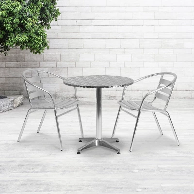 Whether you need to add more seating space or create an intimate conversation area, this versatile round table is up to the task. Enhance the look of your bistro, cafe, restaurant, hotel or home patio space without taking up too much real estate. The designer style stainless steel table top features a smooth surface for keeping items level. The column and base are constructed of lightweight aluminum material making it easy to move this table wherever you need it. Designed for all-weather use, this table is a great option for indoor and outdoor settings. For longevity, care should be taken to protect from long periods of wet weather. Whether you are just starting your business or upgrading your furniture this table is a wise investment.