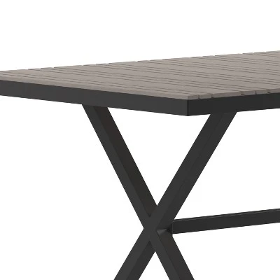 Create a first-rate dining experience at your restaurant or in the backyard with updated commercial grade dining tables. Designed for use in the hospitality industry, as well as your busy household this attractive outdoor dining table features poly resin slats that mimic the look of wood without the maintenance atop an X shaped base. UV treated to prevent fading this patio table will look great season after season. Rust resistant powder coating covers the sturdy welded metal frame capable of holding up to 300 lbs. static weight with seating for up to 6 adults. The lightweight design allows for easy storage and nightly cleanup. Use this table in your kitchen or dining room without worry, the fixed floor glides will protect your indoor flooring. Assembly takes less than 10 minutes and this dining table wipes clean with a damp cloth for quick seating turnaround.