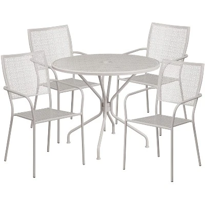 Brighten up your patio space with this beautiful patio table set. This colorful set will enhance your bistro, cafe, restaurant, hotel or home patio space. The top includes an umbrella hole (umbrella not included). The patio chairs stack for storing. The frames are designed for all-weather use making it a great option for indoor and outdoor settings. For longevity, care should be taken to protect from long periods of wet weather. The possibilities are endless with the multitude of environments in which you can use this table, for both commercial and residential spaces. Additional Features: Stacks up to 8 Chairs High, Square Back, Integrated Arms, Rain Flower Seat and Back Design, 1.2mm Tubular Frame