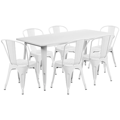The indoor-outdoor rectangular metal table with six stack chairs will give the dining space in your home or restaurant a cool retro-vintage look. The table top measures 31.5 inches wide by 63 inches long and has a smooth top with a 1 inch edge. A stabilizing brace underneath the top gives this table increased stability while still allowing ample leg room. The bistro style chairs feature curved backs with a vertical slat, and a cross brace under the seat for added support and stability. Plastic bumpers on the cross brace protect the chairs’ finish when stacking them. Drain holes in the center of the seat allow water to drain, preventing rust. The smooth, powder coat finish protects the set from scratches and floor glides protect your floors when you need to move it. Designed for both commercial and residential use, this trendy table set will create a lasting impression. Additional Features: Curved Back with Vertical Slat, Drain Holes in Seat, Cross Brace under seat provides extra stability, Plastic Caps on cross brace protect finish when stacked, Protective Rubber Floor Glides