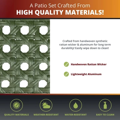 - Material: Crafted with a sturdy cast aluminum frame and table top for long-lasting stability, complemented by comfortable rattan wicker seating.