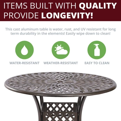 Indulge in an elegant outdoor dining experience with the Kinger Home Arden 41–inch Outdoor Dining Table. Crafted with a strong cast aluminum frame, this lattice weave-designed dining table is both stylish and durable. The round table provides ample dining space and includes a 2.5″ umbrella hole. Pre-installed adjustable foot levelers were included for stability.