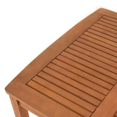 Add style and comfort to your outdoor living space with this set of two attractive eucalyptus wood outdoor chairs with cushions and coordinating cocktail table. Frame is made from durable eucalyptus wood that will stand up to varying weather conditions. The set of two chairs include coordinating back and seat cushions that provide luxurious comfort all day long. The neutral wood finish and cream colored cushions will easily match with any accent pieces in your outdoor space, or pair these beautiful chairs and table with other items in the collection for the perfect outdoor entertainment space!