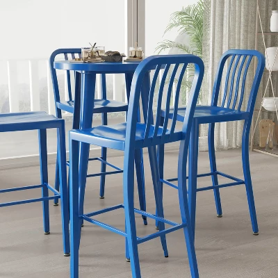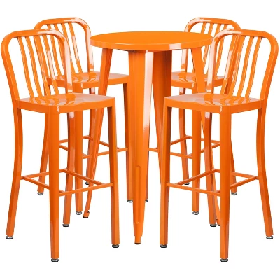 The minimalist profile of each piece in this outdoor table and stools set establishes a new age design and relaxed persona that works well in a variety of concepts. Powder coated metal construction provides all-weather endurance while evoking an industrial aesthetic. The slim back vertical slatted bar stools allow you to relax in a natural sitting position at the table or elsewhere. Each piece is thoughtfully crafted and fitted with rubber floor glides to protect flooring surfaces.