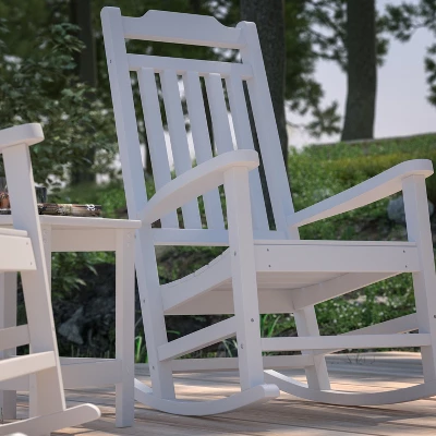 This classically designed rocking chair with matching side table combines the allure of watching a summer sunsets on the front porch with the cozy comfort of your living room, and fittingly enough, you could place this patio rocking chair and table set in either of those locations as well as numerous other relaxed settings. Made of poly resin for impressive durability and all-weather protection, this side table and chair are ideal inside or out.