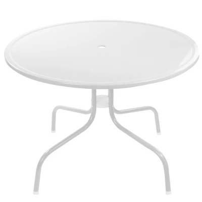 Constructed from premium materials, this dining table boasts a long-lasting weather-resistant enamel paint and a powder-coated finish, ensuring it can withstand the elements and retain its stunning appearance for years to come. Whether it’s scorching sun or pouring rain, this table remains unfazed, making it a perfect addition to your patio, garden, or deck. This table offers ample surface area for placing dishes, beverages, and decor, accommodating both intimate gatherings and larger parties. Equipped with an umbrella hole, allowing you to easily add your favorite patio umbrella for protection from the sun. Features:Outdoor retro metal tulip dining tableColor: whiteLong-lasting weather resistant enamel paintPowder-coated finish Features four legs with white plastic caps and a round topComes in a 5-piece; easy assembly requiredAll weather resistant For indoor or outdoor use Seats up to 4 people (chairs not included)This table pairs beautifully with our matching retro style metal tulip chairs and glidersUmbrella hole fits most standard poles up to 1.5″ in diameter (umbrella not included) Dimensions: 26″ high x 39.25″ diameterMaterial(s): steel/plastic
