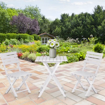 - Three-Piece Patio Bistro Set: Backyard barbeques just got an upgrade; this bistro table set features two outdoor chairs and a square table. Place our table and chairs in the backyard, front yard, balcony, garden, or deck to put on parties, serve drinks, dinner, or play a game with guests.