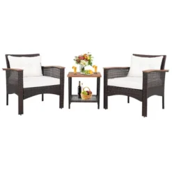 Costway 3PCS Patio Rattan Furniture Set Acacia Wood Table Top W/Shelf Cushioned