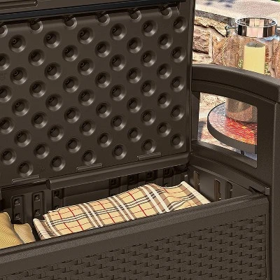 Look classy while you sit and entertain outdoors with this Suncast Elements Wicker Design Loveseat with Storage.It’s a backyard party when this decorative wicker design loveseat makes a home in your outdoor scene. Full of comfort and convenience, this java loveseat has a contoured air-cushion back, extra-large armrests, and is cozy for 2 people. It has a 23-gallon storage capacity under the seat for your outdoor goodies and the seat supports up to 450 pounds.Step up your patio furniture game and enjoy the great outdoors pleasantly with this Suncast Elements Wicker Design Loveseat. This package will also include this Suncast outdoor trash hideaway has a stylish design that looks great on most patios or decks.