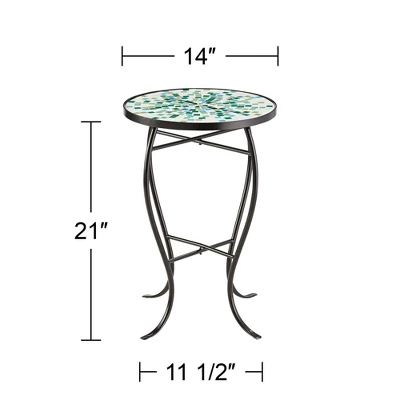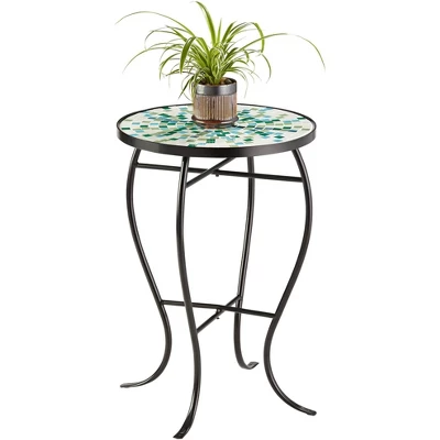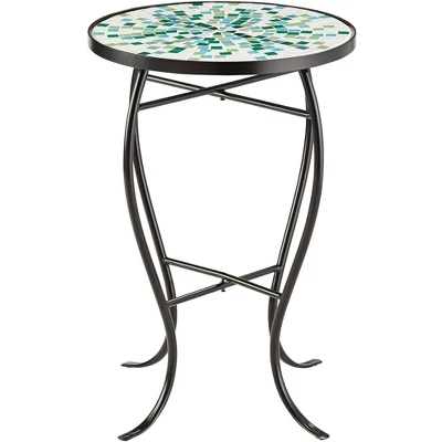 This round outdoor accent table features a sophisticated inlaid tile mosaic top made from aqua blue and green pieces. The frame and curvaceous legs are constructed of black finish iron that will withstand the elements. From the Teal Island Designs brand, this table is a great way to add fresh style and function to a porch or deck.