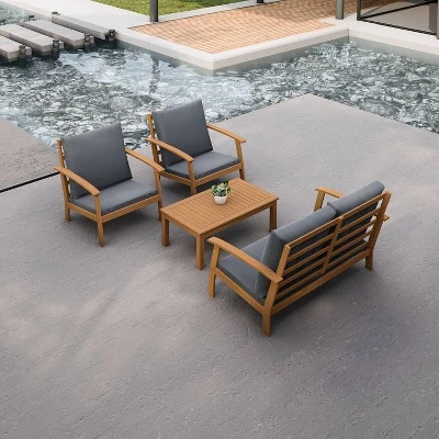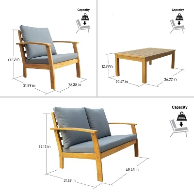 Getting away from it all is now easier than ever. This thoughtfully designed and well-made 4-piece patio set, crafted from FSC certified acacia wood, this furniture collection transforms your outdoor space into an oasis of relaxation. It is sturdy and all weather resistant, the comfortable cushions will maximize your time outdoors while you enjoy with friends and family.